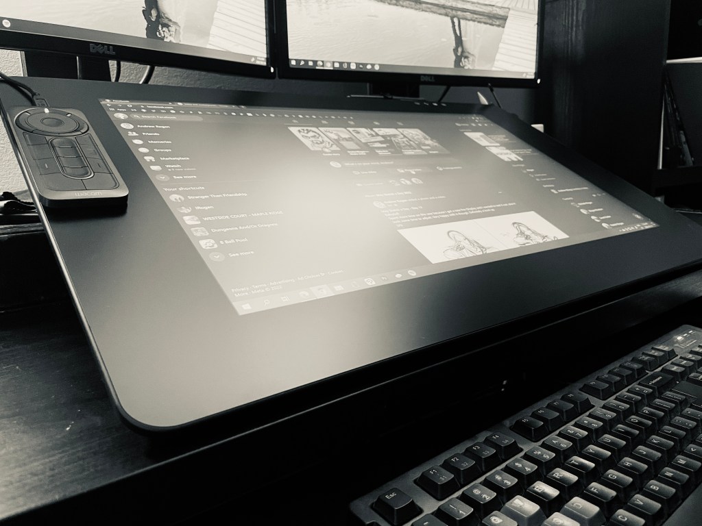 I previously had a Huion 22″, which I’ve gotten great use out of for the past 5-6 years, but I finally decided to invest in the upgrade. And I love it so far, but haven’t really gotten the chance to explore. There definitely is an adjustment period. For starters, its much higher resolution, and much bigger and far more sturdy. I also purchased the ergo stand with it, so I can adjust/tilt/rotate as I feel. Which also works because it has double duty as my main work-from-home monitor.