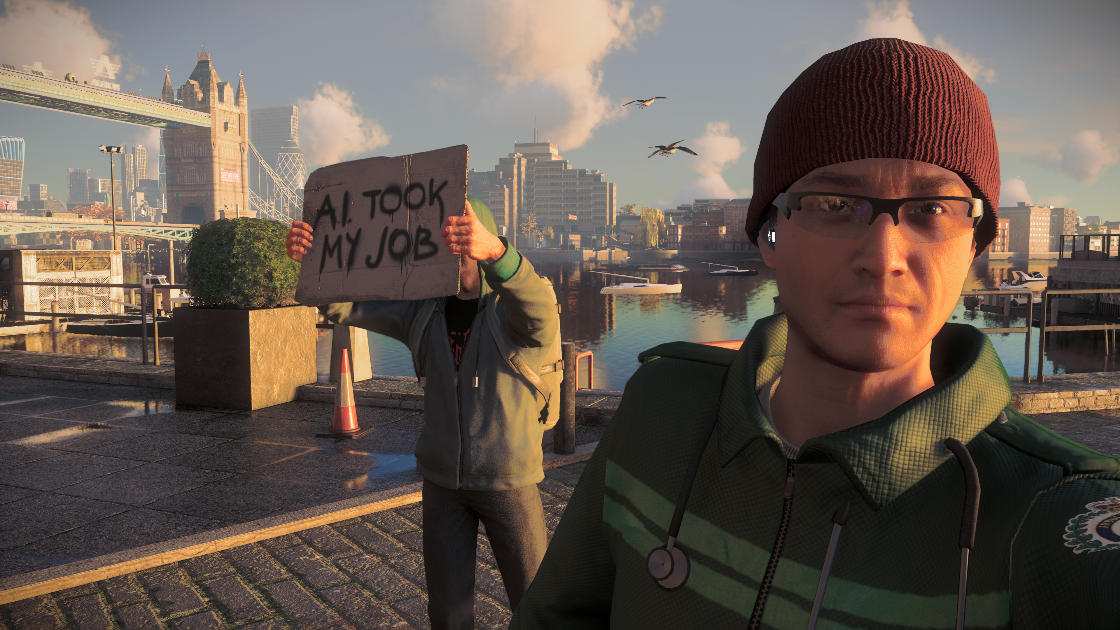 Make way for the recruits. In Watch Dogs 1 and 2, the game proudly proclaimed that you could profile any NPC to find out about who they are, and then hack them and rob them. This game takes it one step further, and turns every NPC into a potential playable character. Every person on the street is a potential recruit. They all have jobs and depending on what they do, can provide gameplay perks. Like a construction worker can call upon a cargo drone at any point, or the former spy comes with a car and unique weapons or watch gadget. The hitman comes with an AR cloak, and the football fan comes with a gang of rowdy friends to help beat people up (leaning on some stereotypes here). Every recruit is unique in their own way, and by the end of the game I think I had accumulated more than 30 different members. Some will be stronger, and better at fighting, some will be better at hacking. There is also a permadeath mode to the game, where if your recruit dies, they’re gone for good, but on the normal mode they just get arrested or injured. And if you have a cop or a doctor-type recruit on your team, the cool down for the arrested or injured recruit is drastically reduced, and they’ll be willing to help again in no time.