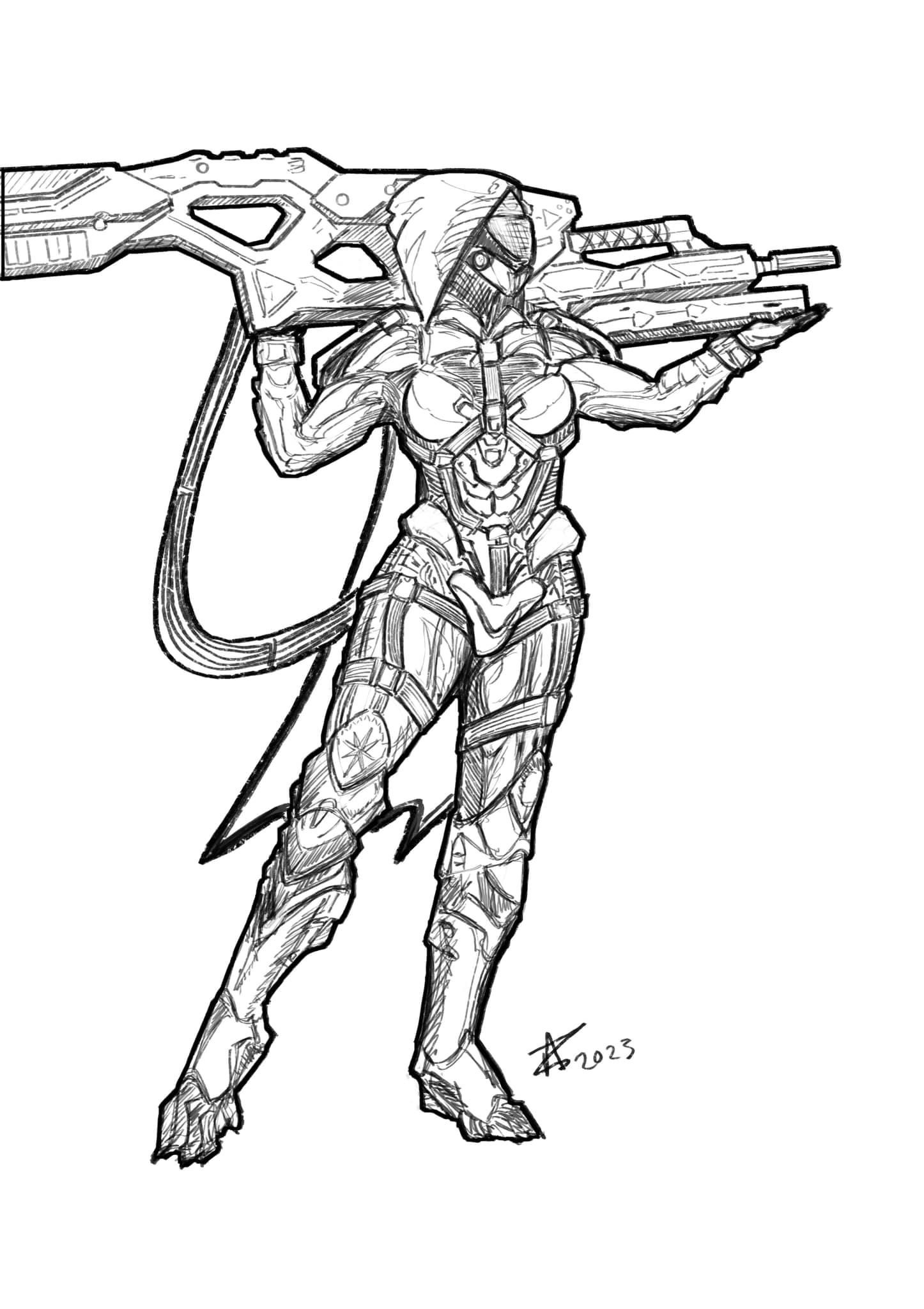 In the art studio I’ve been busy. As I mentioned in the last post, I was playing Exoprimal quite a bit, and had the Vigilant class design stuck in my head and needed to draw it: