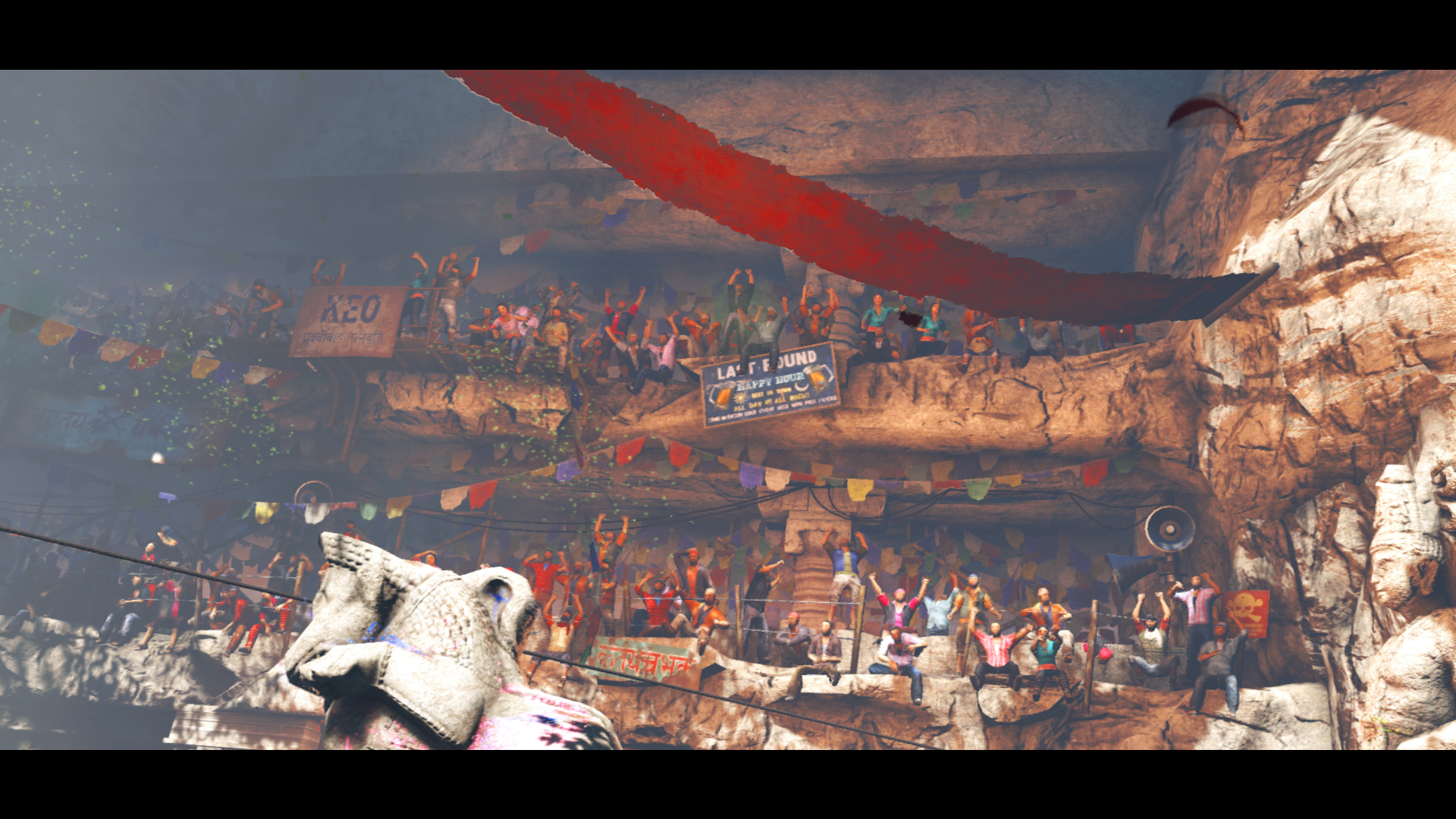 Our caravan is unceremoniously stopped on the way to our Mother’s resting place by the Kyrat Royal Army, a routine identification stop. Things go sideways with the arrival of Pagan Min via helicopter, and we know suddenly something is not right. Speechless, we get a quick glimpse into King Min’s psychosis as he guns down his own Officers to make an impression, taking a selfie with Ajay.
